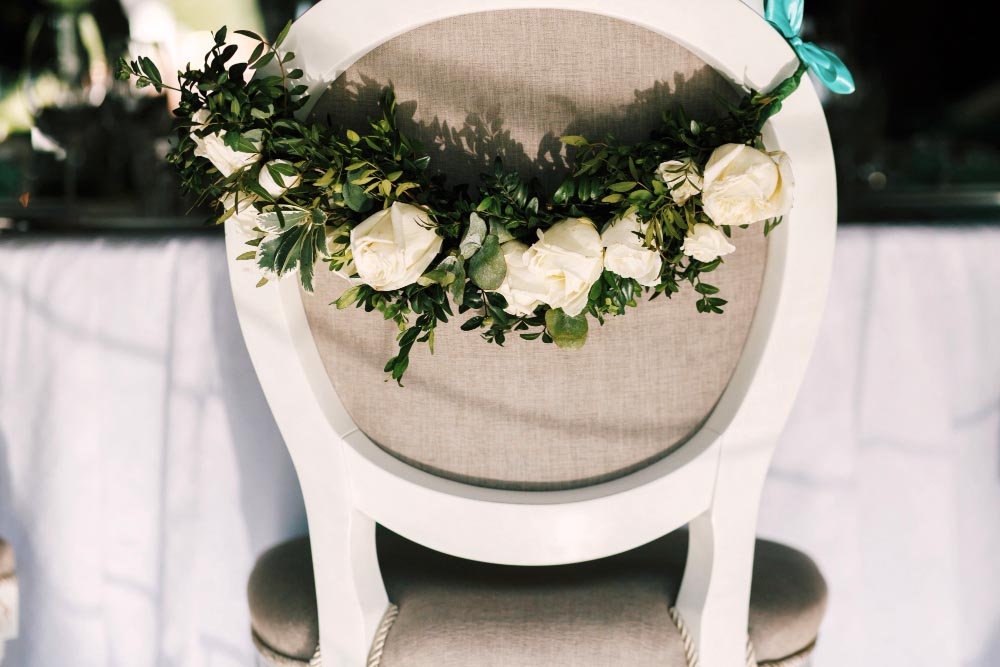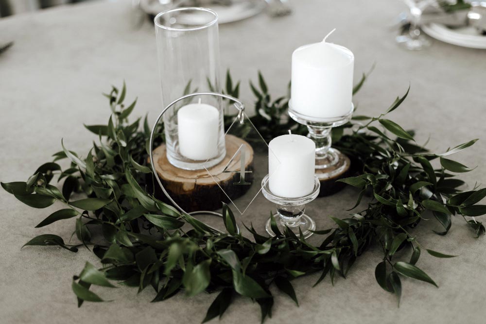 - Les accessoires : guirlandes lumineuses blanches, bougies, vases en verre transparent, nappes en coton ou en toile de jute blanche, arches de fleurs…
