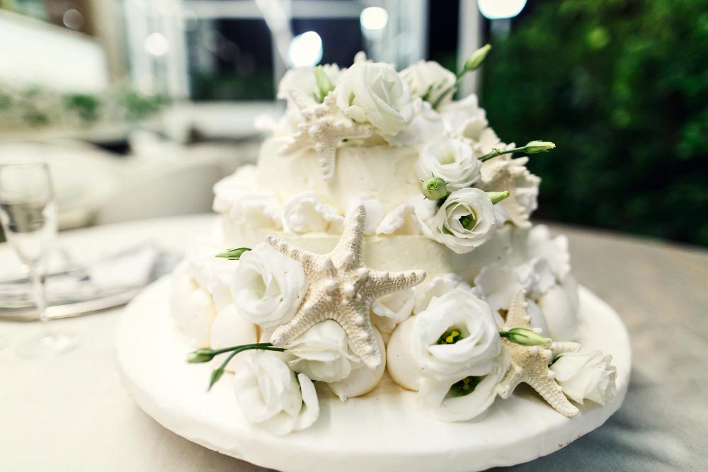 Le blanc peut aussi s’inviter dans la tenue des invités, les faire-part ou même dans le gâteau de mariage glacé blanc et or.