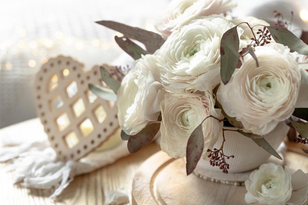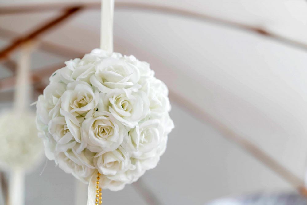 - Les fleurs : roses blanches, lys, pivoines, hortensias, gypsophile… jouer avec leurs formes et volumes dynamise la décoration.